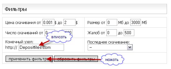 Теперь настраиваем свой аккаунт. Для этого прокрутите страницу до формы установки фильтров. В первое поле вводим Depositfiles.com/ и нажимаем кнопку "применить фильтры"